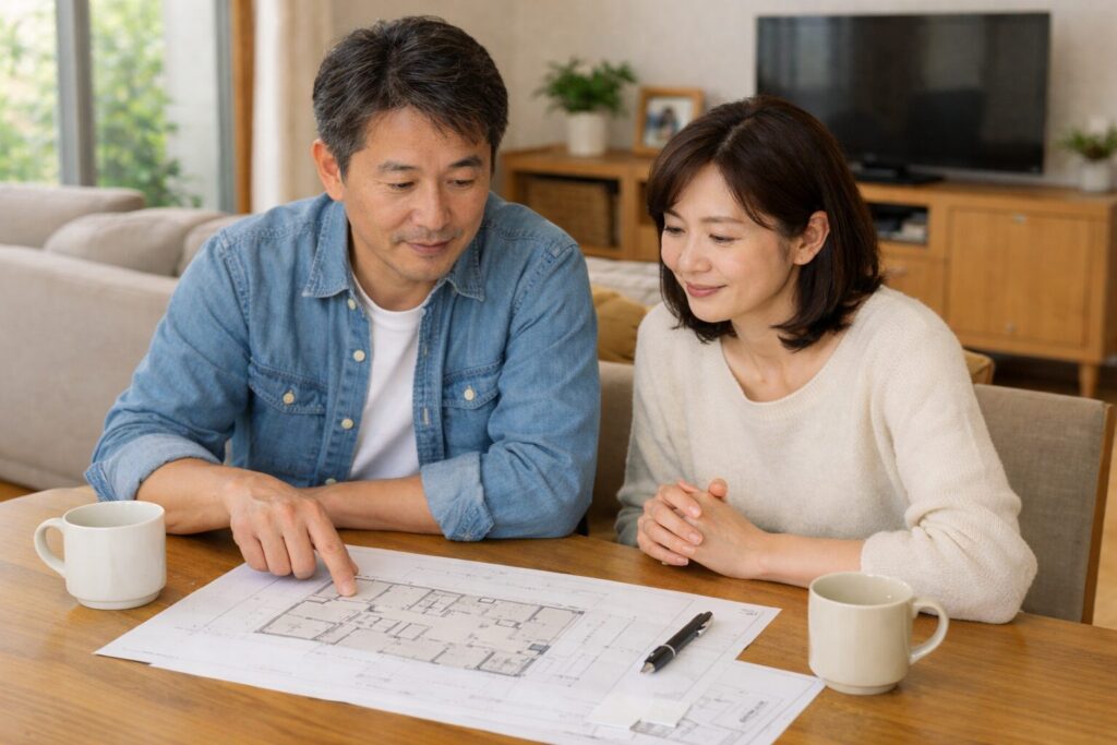 ↑日本の住宅リビングで、図面を見ながら話し合う夫婦。