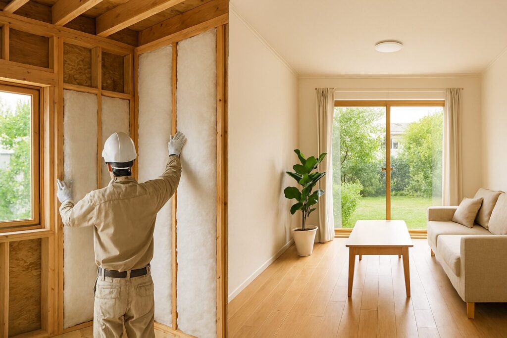 ↑左側に「断熱施工中の住宅内部」、右側に「完成後の快適なリビング」