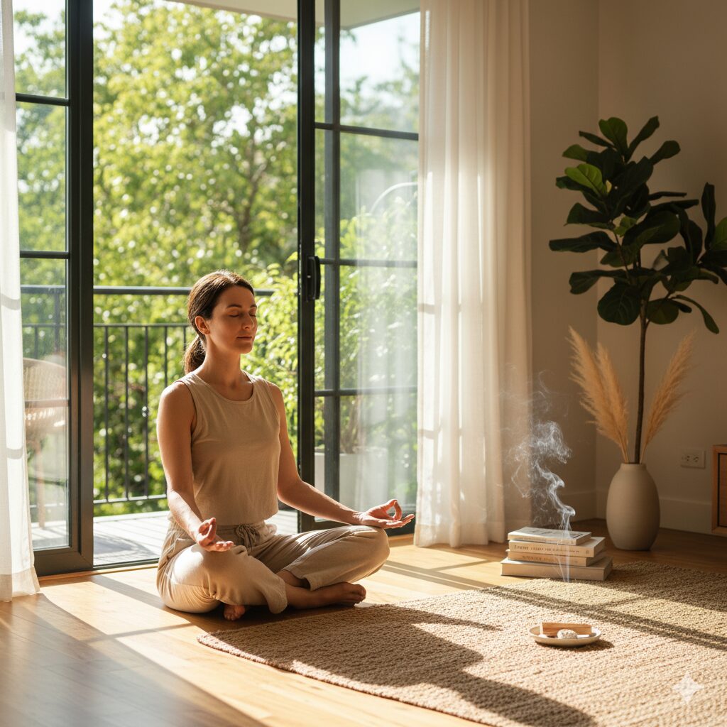 ⇑落ち着いた雰囲気のリビングで、瞑想やヨガを楽しむ人